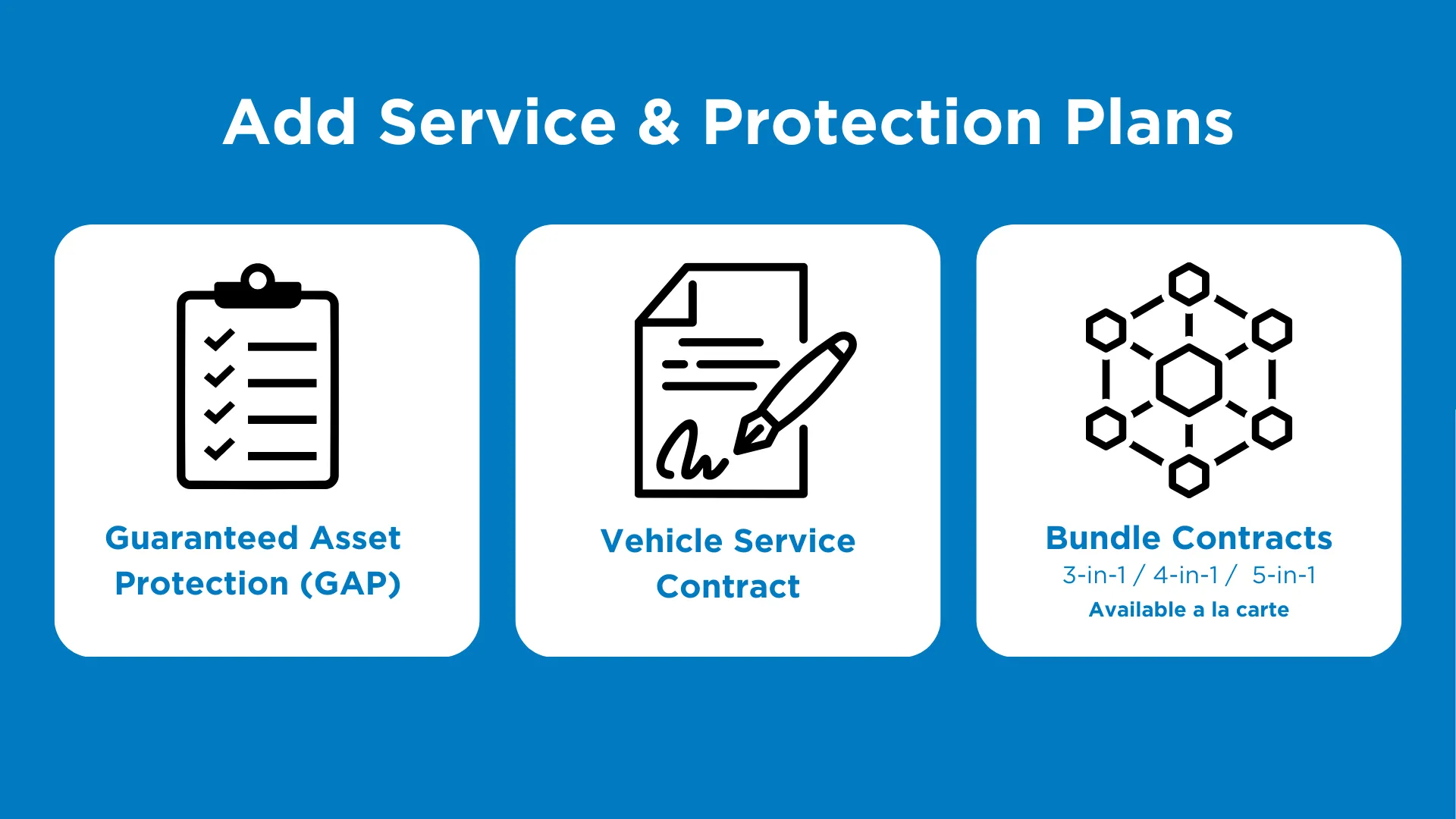 Feel secure as you hit the road with protection against unforeseen events. Select from safeguard options like Vehicle Service Contracts and Prepaid Maintenance for peace of mind on every journey. Our coverage plans include Tire & Wheel Protection, Key Replacement Services, and Gap Protection to keep you from worrying while on the road. Rest assured that we have taken care of all your automotive protection needs.